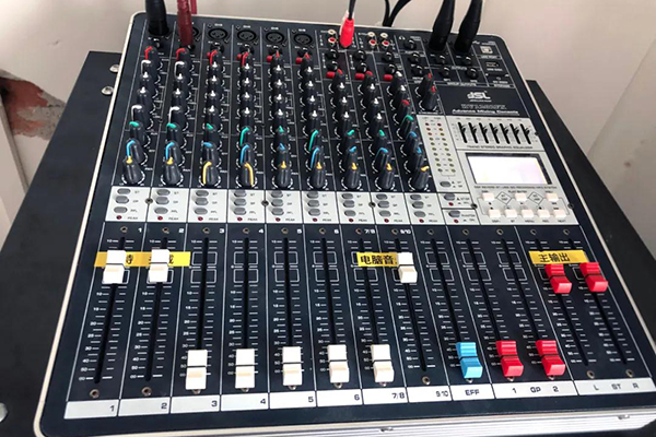 系统开机,先接通调音台电源,接着接通周边电源,最后接通功率放大器(功放)电源。将调音台的输入通道推子推至2/3,输入通道增益调至4/5,主控推子推到0dB左右,试听整个扩声系统的静态噪声,若总的静态噪声较大,打开压限器噪声门,直到噪声稍能听见为止,拉下主控推子,输入声音信号,将左、右声道主控推子再推起,播放声音。