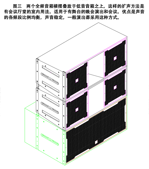 图三,两个全频音箱横摆叠放于低音音箱之上,这样的扩声方法是有会议厅堂的室内用法。适用于有舞台的晚会演出和会议。优点是声音的各频段比例均衡,声音稳点,是很多演出场合的使用方式。