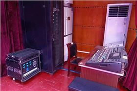 在舞台台口两侧各布置一只双18寸超低频音箱和一只15寸全频音箱,放置在舞台两侧,全频音箱放置在超低频音箱上面;用于拉声像和语言扩声的补充,使多功能厅前区和后区保持声像一致和调整声场不均匀度。