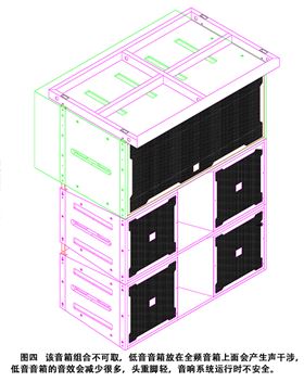 图四,该音箱组合不可取,低音音箱放在全频音箱上面会产生声干涉,低音音箱的音效会减少很多,头重脚轻,音响系统运行时不安全。