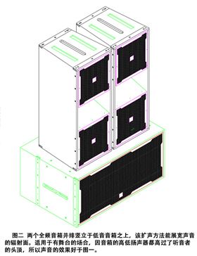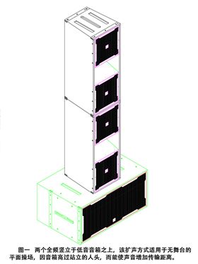 图一,两个全频竖立于低音音箱之上,该扩声方式适用于无舞台的平面操场,因音箱高过站立的人头,而能使声音增加传输距离。