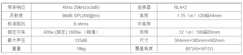 紧凑型两路分频系列,多用途箱体设计,宽广的覆盖角度,1.75VC压缩驱动高音,多悬挂点容易吊装,可调整水平与垂直覆盖角度,12寸低失真高效率中低纸盆单元。