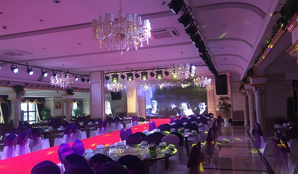 湖北省十堰市某宴会厅音响扩声采用沐鸣2专业线阵音响系统,系统配置包括双8寸线阵音箱、cu12舞台返听音箱、MH-3000功放等设备,采用8+4线阵音响系统吊挂方式,经专业工程师安装调试,在技术上解决整个厅堂前后场声压级均匀度及混响问题 。