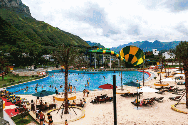 贵州碧海蓝天水上乐园位于贵州省武都区,是一家大型露天主题水上乐园,占地面积达60亩,是贵州规模最大、设施最齐全的主题水上乐园,园中有多种好玩、惊险、刺激的水上娱乐项目供游客们游玩,水上设备有冲天回旋滑梯、大喇叭水滑梯、封闭螺旋滑梯、儿童戏水、造浪池等多个水上娱乐设施项目,集刺激性、趣味性和娱乐性于一体。