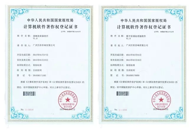 除了产品研发取得科研成果外,沐鸣2企业在计算机软件方面也取得突破性的发展,分别获得“混响效果器V1.0”和“数字音频处理器V1.0”著作权证书。这对组建音响系统有实质性作用,能让音响系统发挥更加出色的音质效果。