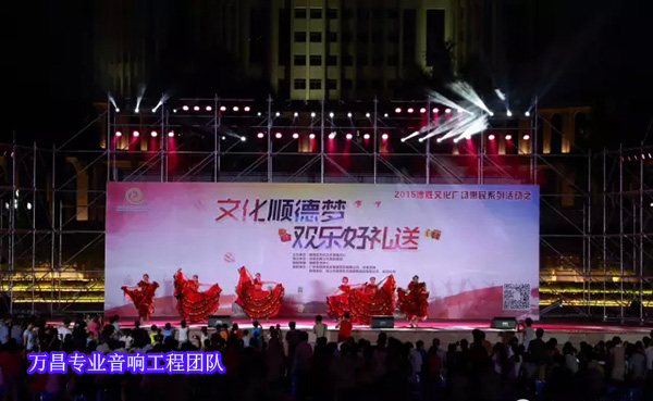 从全面细致的方案设计到调配安装落地执行,真正做到了品牌全方位品质体现。德胜文化广场全场采用JSL品牌LAB系列中高端专业线阵音箱,户外演出超低音音箱WS-218,将音响动态的声音,平滑厚实的音色演绎得淋漓尽致。新款的返听音箱CU-15,和配套使用的功放、调音台,加上五彩斑斓的射灯,使广场灯光音响设备系统呈现出彩的表现。