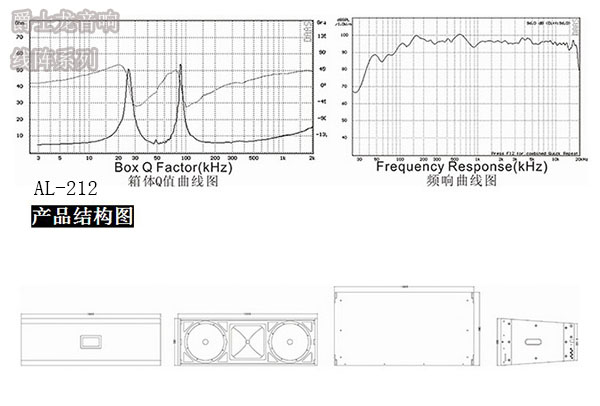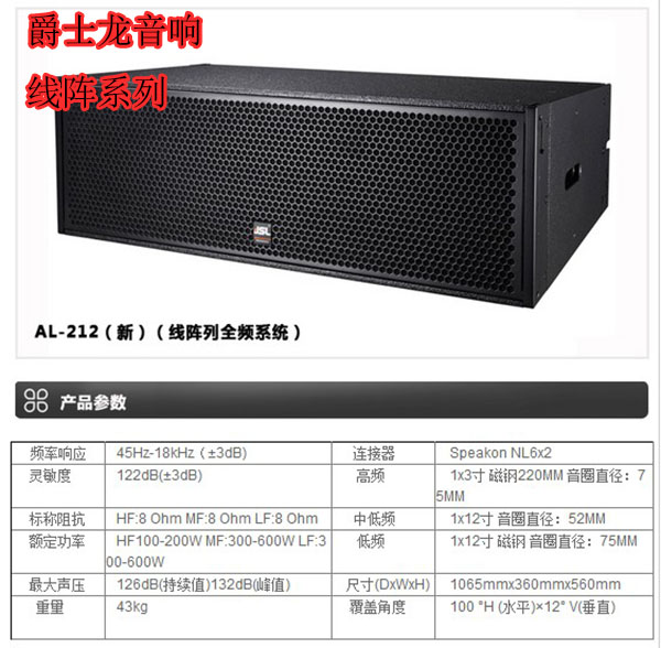 舞台灯光音响设备 AL-212内置两个12"低音单元、一个压缩驱动器系统采用先进的法国阿酷斯技术,使中高频同步输出均等的声压;超薄形箱体,垂直指向12°(单个声箱),声音传输距离更远,在多个声箱紧密排列组成线阵时,声箱相互之间的声波干涉被减到最少,系统采用处理器进行频点分割处理。