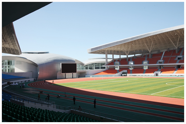 锡林郭勒盟锡林浩特市体育中心(体育场)位于锡林浩特市的新区,体育中心东邻多伦路、西邻宝昌路、南邻城市道路、北邻苏尼特街。该体育场东西看台有挑蓬, 南北无看台, 观众席位为20000席, 体育建筑定位为二级, 可举办运动会田径、足球等地区性赛事及大型文艺演出活动。